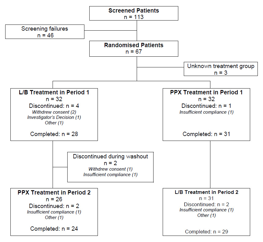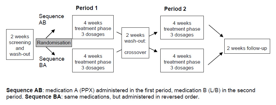Due to insufficient efficacy, the dosage of PPX and L/B was increased from 1 to 2 capsules at day 3 or 4 in 70% and 78% of the patients, respectively, and again increased to 3 capsules in approximately 50% of all patients at day 7 or 8. At day 13 to 15, the dosages were reduced in about 10% of the patients, for L/B (from 3 to 2 capsules) as well as for PPX (from 2 to 1 capsule). During the maintenance period (2 weeks) the dosages were kept constant. The mean daily dosage for PPX was 0.49 mg and for L/B 192/48 mg. The duration of drug exposure was 29 days for both treatments.