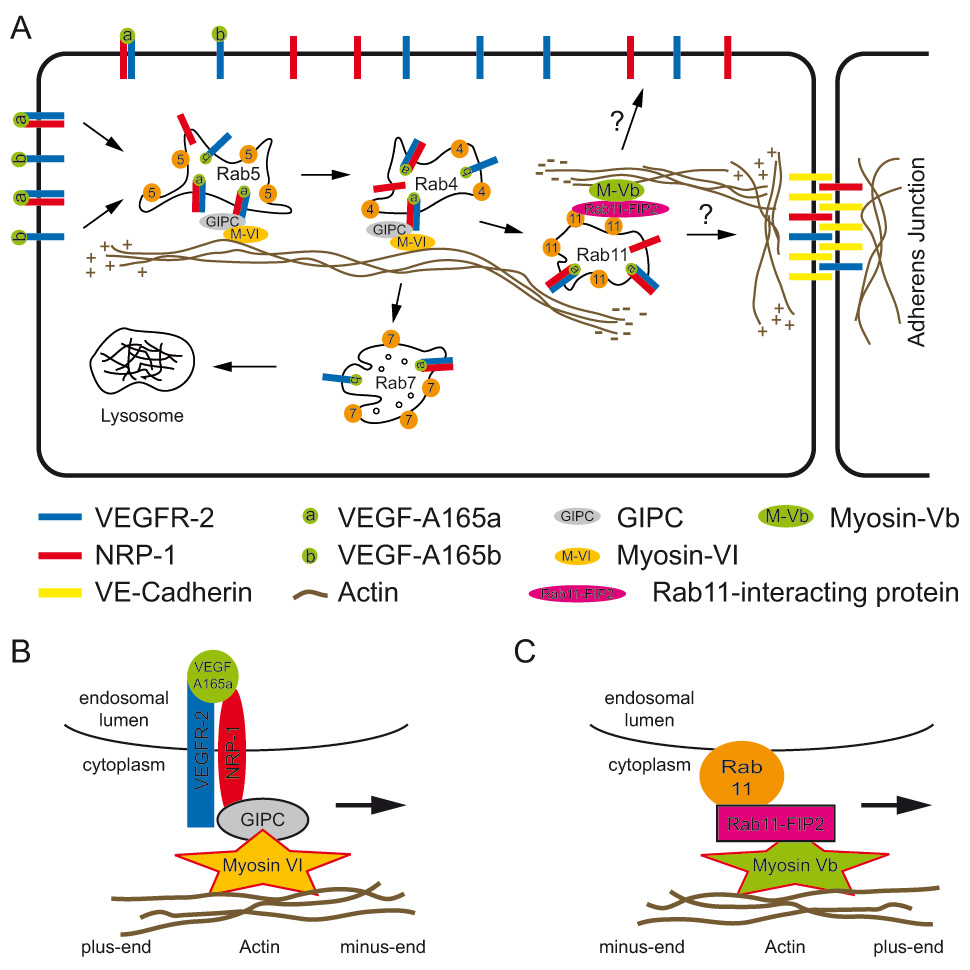 (A) VEGF A165a links NRP-1 to VEGFR-2 leading to internalisation of the complex. NRP-1 rapidly recruits GIPC and myosin VI, a minus-end-directed actin motor. It is unclear how long this complex is active. We assume that it transports the complex to Rab11 vesicles since NRP-1 is necessary for the Rab4 to Rab11 transition. Recycling needs a plus-end-directed myosin motor such as for example myosin Vb, which indirectly interacts with Rab11. The insertion site at the plasma membrane is not known. The recycled factor can either contribute to the free VEGFR-2 pool on the plasma membrane or it can be inserted into adherens junctions. VEGFR-2 bound to VEGF A165b is preferentially routed via Rab5, Rab4, and Rab7 to lysosomes or proteasomes. (B) Detailed view of the minus-end-directed myosin complex. (C) Detailed view of a plus-end-directed myosin complex. Note that suggested role in angiogenesis of the complex shown is not proven yet.