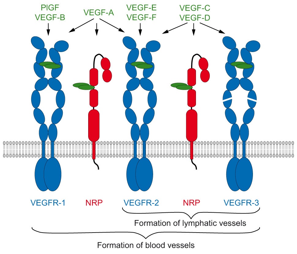 The human genome encodes five VEGF genes (A, B, C, D, and PlGF). Two VEGFs are encoded by viruses (E) and snakes (F), respectively. They all exist as dimers and induce dimerisation of the VEGFRs upon binding. Their binding specificity to the three VEGFRs and NRPs is indicated by arrows.