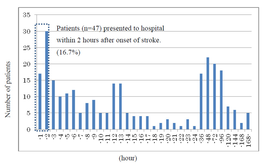 The time to presenting to hospital from the onset of stroke symptoms was investigated at a core hospital in Koriyama City, Fukushima Prefecture. Although our results are preliminary; given their limited generalisability and the retrospective nature of data collection, it is noteworthy that only 16.7% of stroke patients presented to hospital within 2 hours of onset. Multivariate analysis revealed that, rather than social factors, medical factors related to a low severity of a stroke which does not disturb a clear conscious state is significantly associated with presenting to hospital more than 2 hours after onset. Because minor stroke symptoms can be aggravated, it is important to promote the earliest possible admission to hospital after stroke.