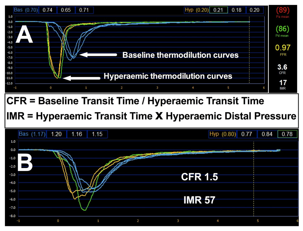 The index of microcirculatory resistance (IMR), defined as the distal coronary pressure divided by the inverse of the hyperaemic mean transit time at maximal hyperaemia, provides a quantitative measurement of coronary microvasculature function that is independent of epicardial stenosis or hemodynamic condition [35].