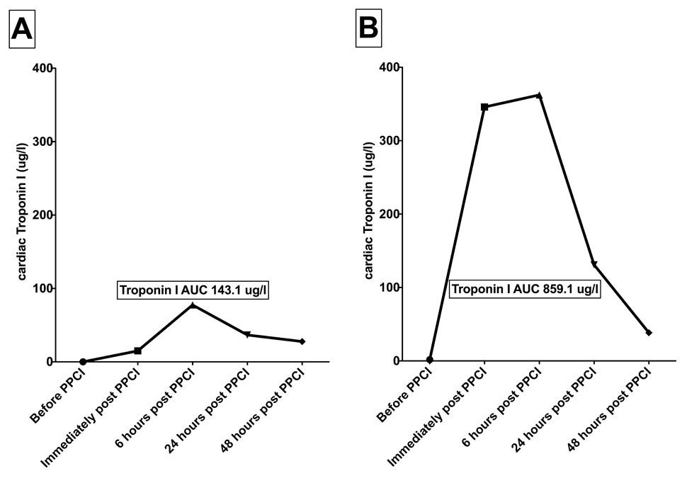 Troponin I curves of two patients with anterior ST-elevation myocardial infarction