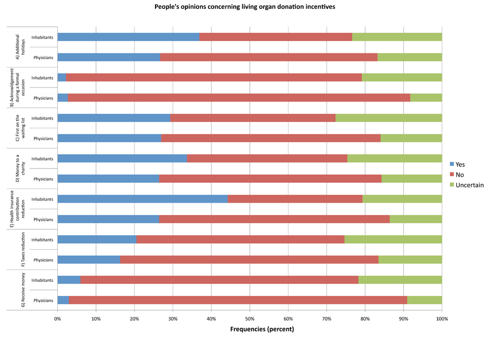 Distribution of the physicians’ and inhabitants’ answers to the different living organ donation incentive propositions.