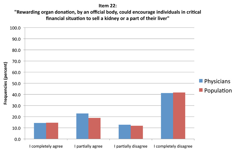 The statistical between-groups comparisons of the positive answers observed for question 26 about living donation (fig. 2) show that inhabitants more frequently chose the items A, C, D, E, F, and G than physicians (in all the cases, Fisher's exact test: p <0.05). Furthermore, the Chi-square test revealed that item B “I would like my action to be recalled in a formal occasion” seemed more attractive to physicians earning between 61’000 and 70’000 CHF than to physicians belonging to other salary classes (χ2(10) = 40.248, p <0.05). In opposition, the inhabitants of the same salary class preferred item E: “I would like my health insurance contributions to be reduced" (χ2(10) = 38.962, p <0.05). This trend was confirmed when comparing the households without children (χ2(10) = 30.038, p <0.05) and with just one child (χ2(10) = 21.744, p <0.05). Finally, inhabitants earning less than 40’000 CHF per year more frequently chose item G than others: “I would like to receive some money” (χ2(10) = 20.582, p <0.05), This result was confirmed when comparing the households with a child (χ2(10) = 30.124, p <0.05). Thus, with regard to the frequencies recorded for item 22 (fig. 6), with which both groups disagree (χ2(3) = 1.455, p = 0.693), we assume that the risk that people in precarious financial situations consider selling a kidney is underestimated by the respondents of both groups.