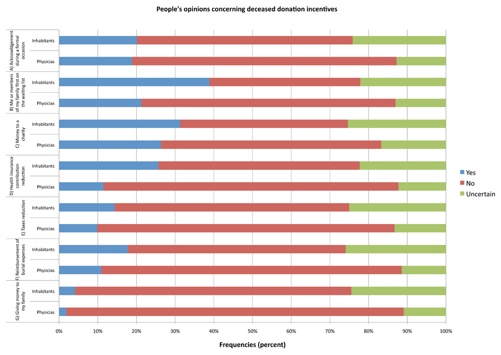 Within this broad cross-sectional study we investigated organ donation and transplantation social perceptions of the French-speaking Vaud county inhabitants and physicians using a postal questionnaire. Among the different topics addressed, some questions investigated people’s opinions about the possibility to introduce incentives to acknowledge the organ donation act.