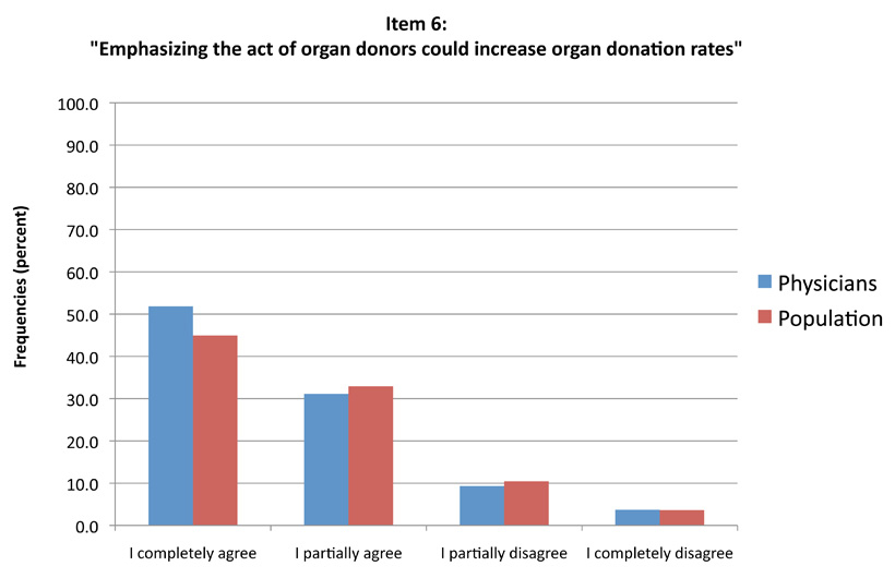 Item 6: “Acknowledging the act of organ donors could increase organ donation rates” got a consensus from the two populations under investigation (fig. 1). Respondents from both populations agreed with it, without significant differences detected by the Chi-square (χ2(3) = 2.331, p = 0.507).