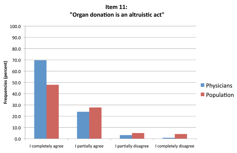 The answers recorded for items 7 (fig. 4) and 11 (fig. 5) allow us to make assumptions about the possible reasons of their reluctance: on the one hand, inhabitants agree with the fact that the value of an organ can’t be quantified financially (Mann-Whitney test: U = 93759.000, p <0.05). On the other hand, physicians unanimously considered that the organ donation is an altruistic act (χ2(3) = 26.097, p <0.05).