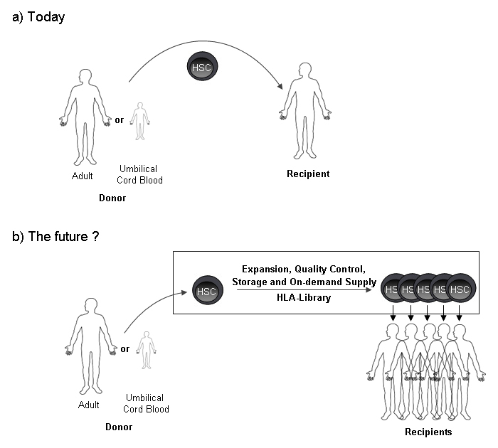 However, several major challenges remain regarding quality and timely availability of allogeneic HSC grafts for patients in need: a) patients with rare HLA-types (e.g., rare allele frequency and combination, minority populations) rarely find a donor; b) potential donors might not be available when needed, e.g., due to so far undetected co-morbidities as infection or cancer; c) donor search and confirmation of availability consumes time prohibitive for adequate control of the disease. Thus, immediately available, HLA-matched, quality controlled and off the shelf produced HSC transplants would greatly serve these needs.