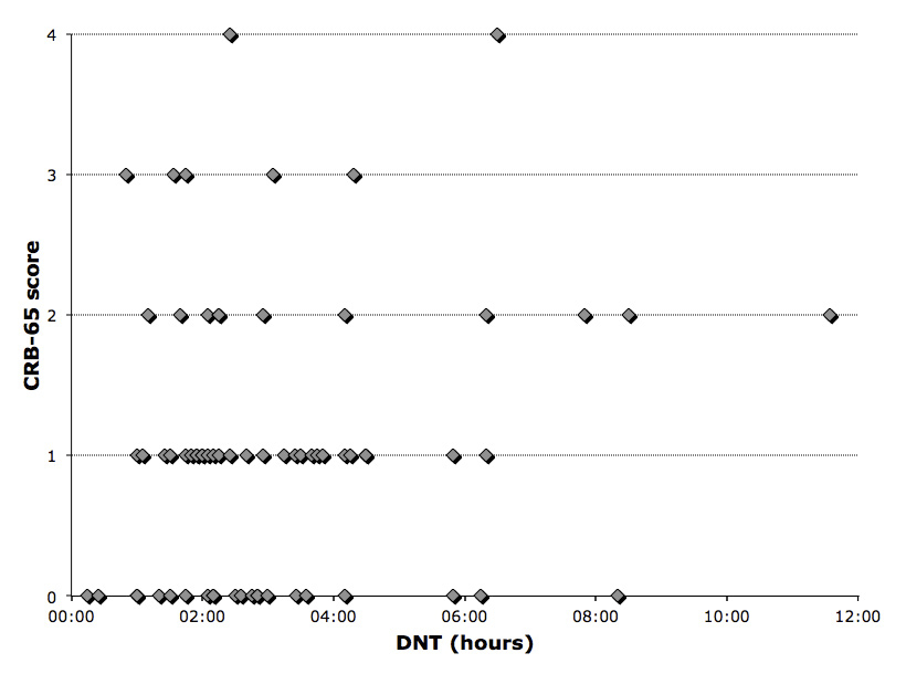 The purpose of this study was to determine DNT in our hospital setting in the treatment of patients with severe infections such as CAP and sepsis. In patients admitted with the diagnosis of CAP, the CRB-65 score was retrospectively calculated. We examined if the CRB-65 score had an influence on the timing of antibiotics administration. The correlation between DNT and the CRB-65 score was our main focus and furthermore we investigated if other parameters might lead to a shorter DNT in CAP patients and patients with sepsis.