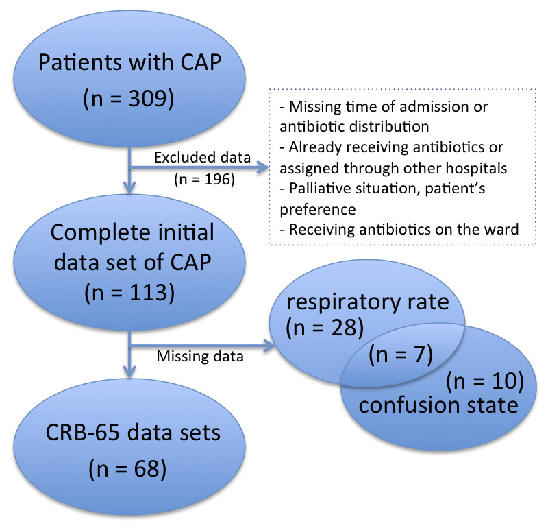 Due to the retrospective nature of the study, the CRB-65 score had to be calculated out of clinical examination notes. If this was not possible the data was denoted incomplete and therefore excluded. In 68 data sets (60% from the completed data sets of CAP), the CRB-65 score could be calculated. All other collected parameters, e.g. temperature, pulse and blood pressure, were only used if they had been taken before any intervention took place and they had to be clearly declared as first measurements. CRP and WBC were collected from the first blood examination, which had to be taken prior to the antibiotic treatment.