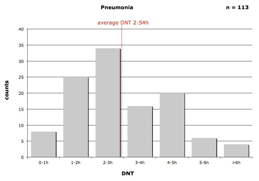 In figure 2 the DNT for CAP patients is presented. More than half of the patients (59.3% (67/113)) were diagnosed and treated within 3 hours of admission to our ED. 73% (83/113) of all patients received antibiotics within the recommended 4 hours. In 4 cases (3.5%; 4/113) the DNT was longer than 6 hours. The fastest application took place after 15 minutes, the longest time interval for DNT was over 10 hours.