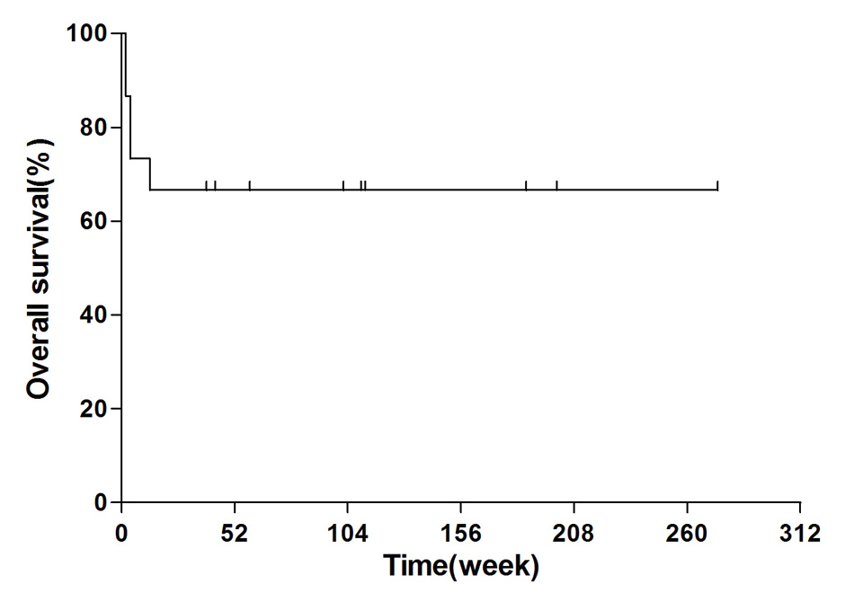 The one-year probability of overall survival of the fifteen patients with sHLH treated with COP regimen was 66.7%.