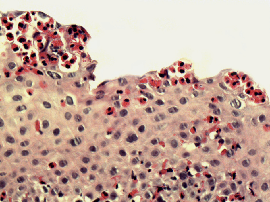 The histograph, taken from an adult patient with active EoE, shows a dense infiltration of the squamous esophageal epithelium with eosinophils and dilated intercellular spaces. H&E staining, original magnification x200.