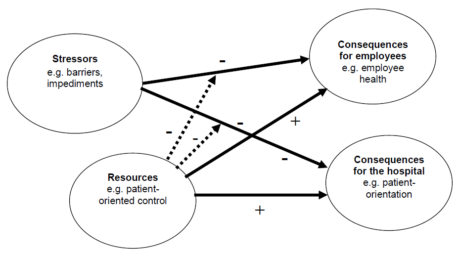 Simplified model of the relationships of stressors, resources and consequences for employees and for the hospital.