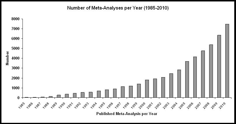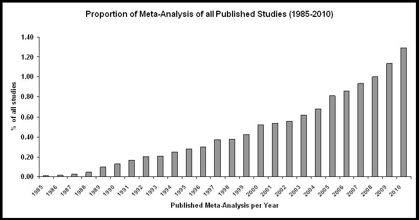 B: Increase in proportion of meta-analyses of all published studies in MEDLINE from 1985 to 2010.