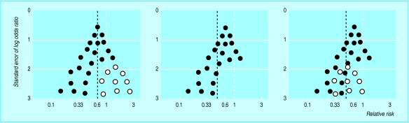 Hypothetical funnel plots: left, symmetrical plot in absence of bias (open circles are smaller studies showing no beneficial effects); centre, asymmetrical plot in presence of publication bias (smaller studies showing no beneficial effects are missing); right, asymmetrical plot in presence of bias due to low methodological quality of smaller studies (open circles are small studies of inadequate quality whose results are biased towards larger effects). Dotted black lines are pooled summary estimates. Pooled estimates exaggerate treatment effects in presence of bias (from Sterne et al. Investigating and dealing with publication and other biases in meta-analysis. BMJ. 2001;323:101–5. Reprinted with the permission from BMJ Publishing Group Ltd.)