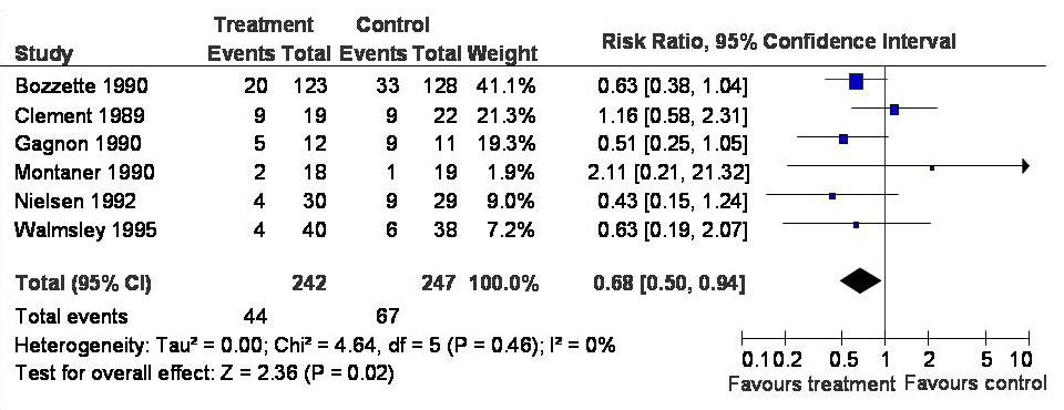 The centre of the squares and the horizontal lines correspond to the relative risk or risk ratio (RR) and 95% confidence intervals (CIs). The area of the squares is proportional to the weight each trial contributes to the meta-analysis. The diamond at the bottom of the graph represents the summary RR and its 95% CI indicating a reduction of 32% (95% CI 6 to 50%) in the risk of death when adjunctive corticosteroids are used in pneumocystistis jiroveci pneumonia. The solid vertical line corresponds to no effect of treatment (RR 1.0). The RR, 95% CI and weights are also given in tabular form (adapted from [48] Briel M, Bucher HC, Boscacci R, Furrer H: Adjunctive corticosteroids for Pneumocystis jiroveci pneumonia in patients with HIV-infection. Cochrane Database Syst Rev. 2006 Jul 19;3:CD006150. Reprinted with the permission from John Wiley and Sons).