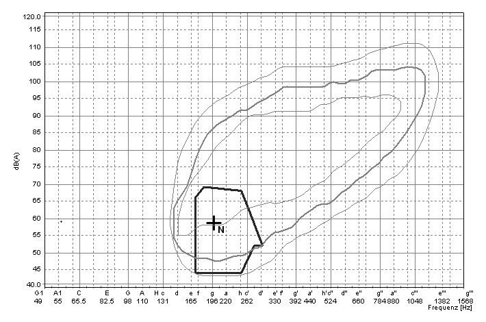 Voice range profile (example). The cross symbolises the averaged dB value for 1 of the 2 tasks. (Reprinted with permission from WEVOSYS.)
