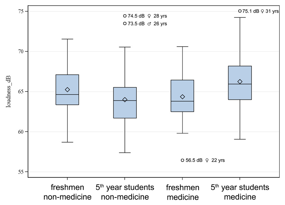 The mean sound pressure level of freshmen in medicine was, on average, 64.4 dB (SD 3.0), that of fifth-year medical students, 66.3 dB (3.7). The respective scores of non-medical students were 65.2 (SD 2.7) for freshmen and 64.0 (3.4) for fifth-year students. When considered separately, men and women displayed the same tendency: The mean scores of first semester women in medicine were 64.2 (SD 3.1) and 65.9 (3.7) for fifth-year women in medicine, that of men 64.5 (SD 2.9) and 66.7 (3.7), respectively. The respective scores in non-medicine students were 65.3 (SD 2.2) and 64.2 (3.2) for women and 65.2 (3.3) and 63.7 (3.8) for men.