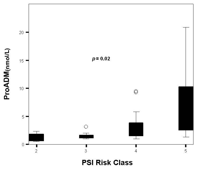 Overall measurements of the three biomarkers are presented in table 1. In all cases, proADM values at ICU admission were pathological. Although not statistically significant, patients in septic shock had higher levels of proADM than the group of patients in severe sepsis [2.7 (1.5–8.9) nmol/L vs. 1.3 (1.0–3.2); p= 0.08]. Neither PCT nor CRP levels could discriminate between these populations [9.3 (3.3–29.2) ng/ml vs. 13.1 (3.3-23.7) ng/ml; p = 0.51] and [25.1 (14.4–32.7) vs. 17.8 (10.1–28.8); p= 0.18] respectively. ProADM consistently rose as PSI class advanced from II to V (p = 0.02) (fig. 1 and table 2). Differences across PSI class were not significant for CRP (p = 0.73) and PCT (p = 0.12) (fig. 2 and 3 and table 2). Median proADM levels were higher in non-survivors than in survivors 5.0 (1.9–10.1) nmol/L vs. survivors 1.7 (1.3–3.1) nmol/L; p <0.01). These differences were also significant with respect to ICU mortality 6.6 (1.5–15.4) nmol/L vs 2.0 (1.4–3.4) nmol/L; p <0.01. Patients with renal failure (defined as serum creatinine higher than 2 mg/dl) presented higher levels of proADM than patients with normal function, although the difference did not reach statistical significance: 1.6 (1.2–3.6) vs 2.8 (1.5–7.7) nmol/L; p = 0.34.