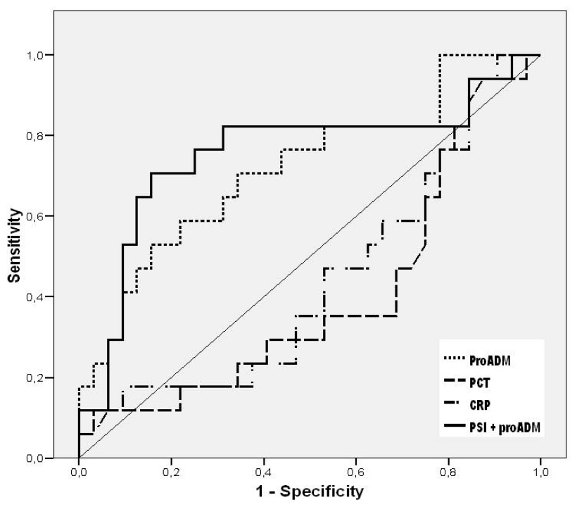 The receiver-operating characteristic curve for proADM yielded an AUC of 0.72, higher than the AUC for PCT and CRP (0.40 and 0.44 respectively) and similar to PSI (0.74).The association of proADM and PSI only slightly increased the accuracy of PSI in determining the risk of hospital mortality (AUC = 0.76) (fig. 4). The optimal prognostic cut-off (maximum combined sensitivity and specificity) related to in-hospital mortality for proADM was 4.86 nmol/L, with a sensitivity of 0.53, specificity of 0.84, positive likelihood ratio of 3.39, negative likelihood ratio of 0.56, positive predictive value of 64.3 and negative predictive value of 77.1. Patients with a plasma proADM level higher than 4.86 nmol/L on ICU admission had in-hospital mortality significantly higher than those with a lower value (60% vs. 23.5%; p= 0.02).