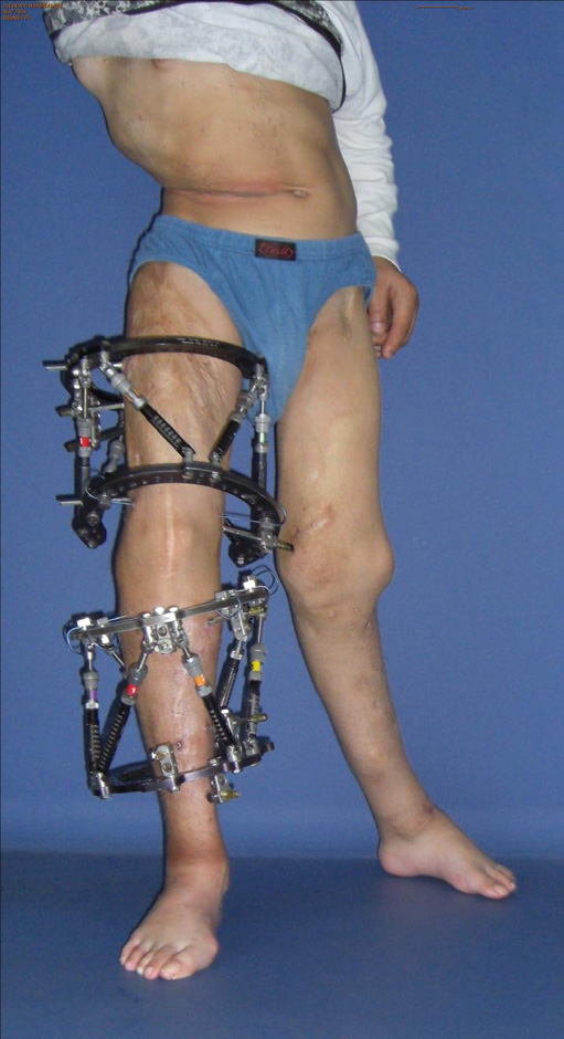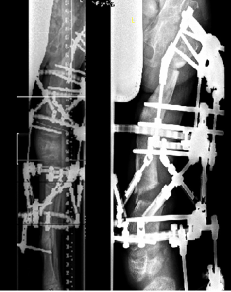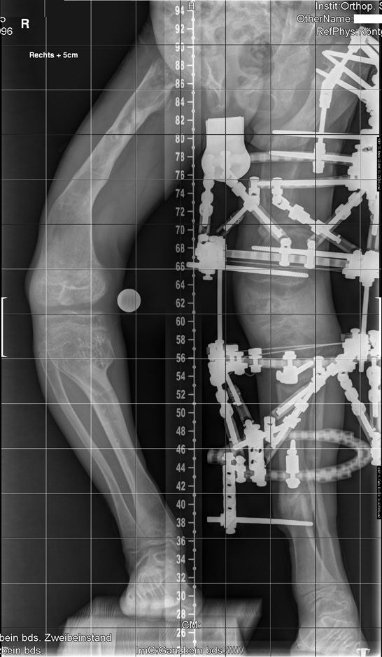 After consolidation and removal of the frame, a prophylactic nailing of the right femur and tibia was performed to obtain the correction.