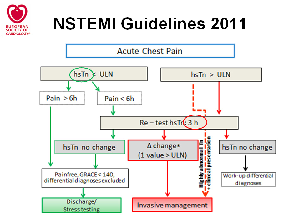 Accordingly, the current 2011 ESC guidelines suggest that AMI can be safely ruled out once hs-cTn levels are normal in a patient presenting with a chest pain onset more than 6 hours prior to ED presentation. In addition, the 2011 ESC guidelines suggest that these patients, if pain-free and perceived to be at low risk of dying within the next months by a validated risk score (with less than 140 points in the GRACE risk score), can be discharged from the ED for further outpatient management.