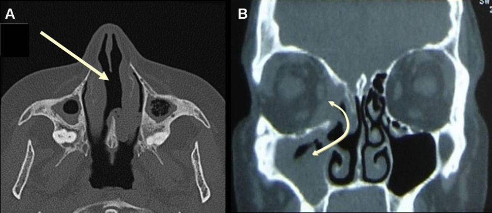 Nasal cartilage erosion and lysis are classic signs of GPA, although not totally specific, and can result in nasal septum perforation, saddle nose deformity (fig. 1 and 2A) and/or orbito-sinusal or sinuso-palatal fistula (fig. 2B and 3). Nasal septum perforation usually occurs in the anterior nasal septum in the area of Kiesselbach’s plexus and is suggestive of GPA but not specific. Cocaine-induced perforation, infection (as in tuberculosis), and antiphospholipid syndrome are other potential causes. However, in contrast to GPA, septal perforation related to cocaine abuse is usually associated with otherwise clean URT mucosa. Saddle nose deformity occurs in 10% to 25% of patients, quite rapidly and chiefly during the early phases of the disease; however, it is also not pathognomonic for GPA. Other causes include bare lymphocyte syndrome (deficit in transporter for antigen presentation), relapsing polychondritis, congenital syphilis, paranasal sinus malignancy, midline lymphoma or, simply, trauma. Why some patients develop nasal deformity or septum perforation and others do not remains unexplained. To date, studies have only demonstrated more frequent nasal deformity with SGS (on univariable analysis) and retro-orbital masses (on uni- and multivariable analyses) [36].