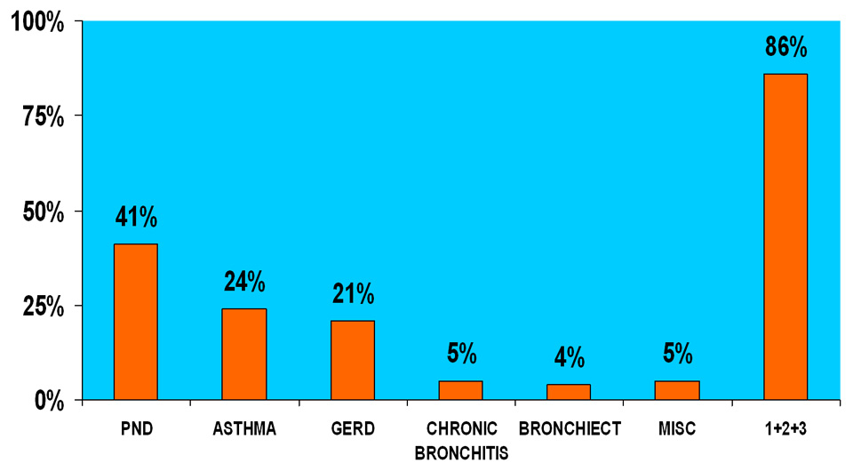 Chronic cough, defined as cough >8 weeks duration, is a common condition evaluated by physicians in the U.S. [12, 13]. In non-smoking patients with normal chest X-rays, who are not taking angiotensin converting enzyme (ACE) inhibitors, the most common causes of cough include postnasal drip syndrome (PNDS), asthma, gastroesophageal reflux and chronic bronchitis, and these four conditions may account for up to 90% of cases of chronic cough [14] (fig. 2). Poe et al. found that GER alone accounted for cough in 13% of their study population, while in 56% of patients, it was a contributing factor to persistence of cough [8]. Evaluation of chronic cough generally begins with the diagnostic protocol developed by Irwin et al. [15]. This protocol evaluates the chronic cough patients who have normal chest X-rays and are not taking ACE inhibitors, for the three most common causes of cough: postnasal drip syndrome (PNDS), asthma, and GER. Once PNDS and asthma have been excluded, patients can then undergo evaluation for GER. It is important to recognise that chronic cough can occur by at least two mechanisms: 1) direct reflux of gastroduodenal contents in which case laryngitis may be evident by laryngeal evaluation. In this case patients may be diagnosed with laryngopharyngeal reflux (LPR) and appropriately treated. 2) Chronic cough may also occur indirectly via vagal mechanisms in which case laryngeal irritation may not be evident.