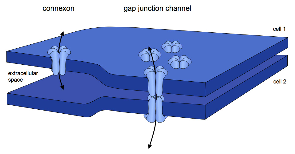 Connexins form connexons composed of six connexins in the Golgi apparatus. Thereafter, connexons can be inserted in the plasma membrane where they can function as connexons (hemi-channels; left) or as gap junctions (right) if they dock to a connexon expressed by a neighbouring cell. Connexons allow exchange of small molecules (<1000 Da) between the cytosol and the extracellular space. Gap junctions allow passage of similar molecules between adjacent cells.