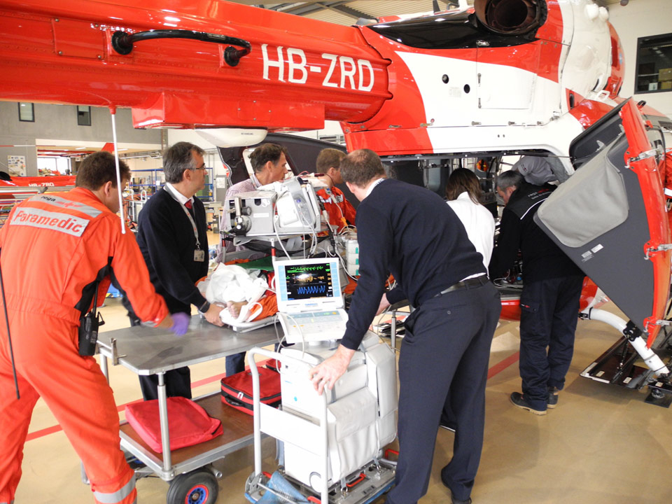 During the entire transfer from the patient’s initial location in the referring hospital until the handover at the target location in the receiving hospital, the regular helicopter monitoring, infusion pumps and ventilator were employed. A Propaq Encore monitor (Protocol Systems, Inc, Beaverton, OR, USA), providing standard monitoring (ECG, non-invasive blood pressure and SpO2) including invasive arterial pressure and end-tidal CO2-measurement, was used for haemodynamic and respiratory surveillance of the patient during transport. If necessary, ventilation was provided using an Oxylog 3000 (Draeger Medical, Lübeck, Germany; SRMS 0020), and infusion pumps (Braun, Melsungen, Germany) were connected (fig. 3).