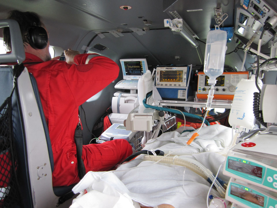 Intra-aortic balloon pump (IABP) counter-pulsation support is a recommended option for patients with cardiac failure, mainly due to coronary artery disease or congestive heart failure [1, 2]. Early IABP support is used to accompany acute percutaneous coronary intervention (PCI) or cardiac surgery. In addition, IABP support may function as a bridge prior to invasive procedures if these specialities are not immediately available or are unavailable at the initial hospital of admission. If in such a situation inter-hospital transfer is mandatory, IABP support must be maintained. Inter-hospital transfers of patients with IABP support have been successfully carried out by ground and by air transport [3, 4]. Since July 2008, the Swiss Air-Rescue (Rega, Zurich-Airport) has been willing to provide IABP transports by helicopter or jet, 24 hours a day, 365 days a year. The IABP can be supplemented with an air transport approved extracorporeal membrane oxygenation device and/or with a left ventricular assist device (e.g., Novalung®, Impella®, Life-Box® and Cardiohelp®).