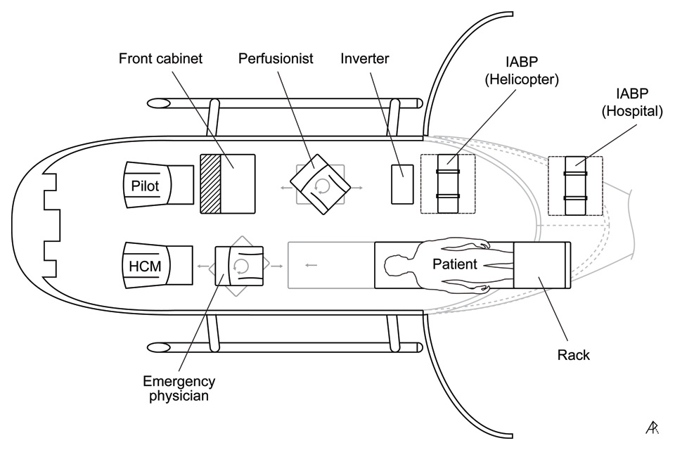 All patients for IABP transfer were transported by a Eurocopter EC145 helicopter, staffed with the standard Rega helicopter crew (pilot, helicopter emergency medical services crew member (HCM) and emergency physician) and reinforced by a certified perfusionist. The emergency physicians involved were board-certified anaesthesiologists or anaesthesiologists at certification level with training in cardiac anaesthesia, plus board-certified pre-hospital emergency physicians (Fähigkeitsausweis Notarzt SGNOR) or pre-hospital emergency physicians at certification level. Positioning of the patient, crew members and specific devices within the helicopter is shown in figure 1.