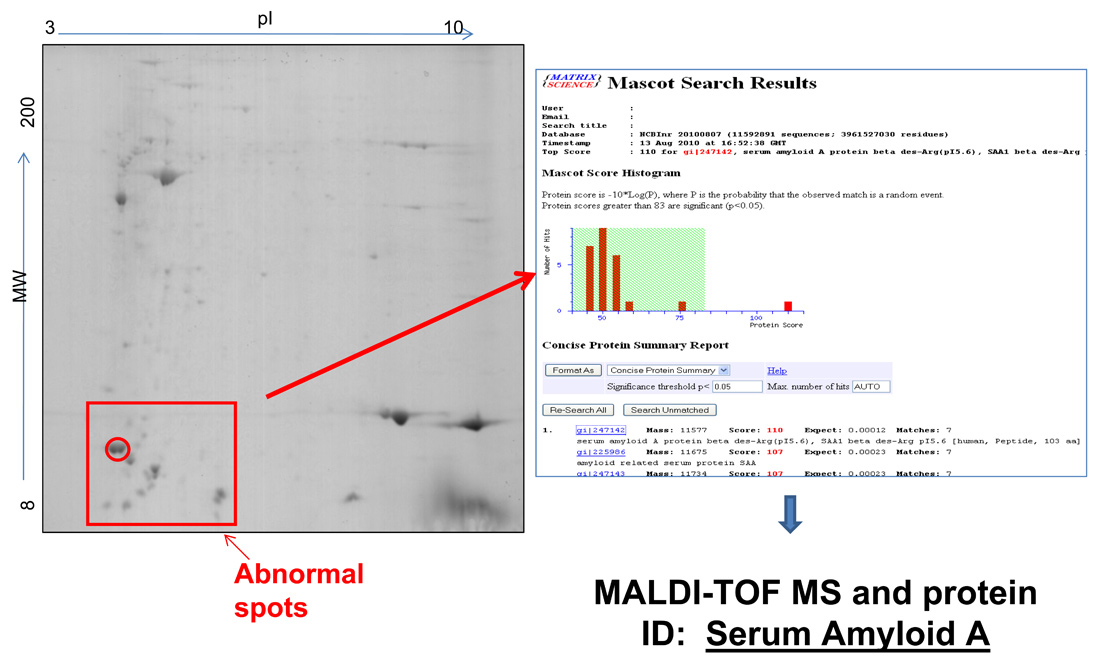 Typical 2D-PAGE map of fat tissue in AA amyloidosis.A 73-year old man presented with signs of renal and gastrointestinal amyloidosis. Immunohistochemistry classified the disease as ALκ type. However, due to the absence of a serum or urine monoclonal component, with normal serum free kappa light chains and κ/λ ratio, this result was considered inconclusive. Proteomic analysis by means of two-dimensional polyacrylamide gel electrophoresis (2D-PAGE, left panel) showed the presence of abnormal spots (in the box) that are not found in controls. Mass spectrometry analysis of excised spots, followed by data base search (right panel) characterized these spots as N-terminal fragments of SAA, allowing definite typing of amyloidosis.