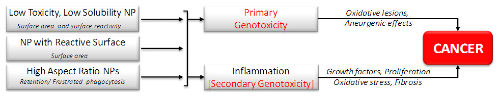 A substance is considered genotoxic if it deleteriously affects the genome of a cell either by direct or indirect damage to the cellular DNA including effects on the cellular pathways that monitor and protect genome integrity. In situations where a particle or substance directly interacts with the genomic DNA and causes damage, the effect is said to be direct primary genotoxicity and this, by its nature is independent of inflammation [17]. This can include the formation of DNA lesions such as 8-oxo-7,8-dihydro-2'-deoxyguanosine due to intrinsic free radical production from the particle or through direct binding of the particle with the DNA or component of the cell division machinery such as centromeres or microtubule spindle causing an aneugenic effect. Indirect primary genotoxicity in contrast occurs when intracellular antioxidants are depleted and therefore results in an imbalance between cellular steady-state oxidants (i.e. produced during normal cellular activities such as respiration) and the depleted anti-oxidants leading to a situation of oxidative stress driven genotoxicity [4].