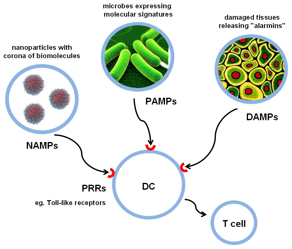 Do nanoparticles act as danger signals and/or display such signals on their surface? In this hypothetical diagram, the analogy is made between pathogens (microorganisms) that display pathogen-associated molecular patterns (PAMPs) and damaged or stressed tissues that release damage-associated molecular patterns (DAMPs), such as HMGB1, a non-histone nuclear protein that acts as a secreted alarmin, and engineered nanoparticles that are coated with a bio-corona of proteins, possibly unfolded, thereby revealing hidden epitopes, that may act as nanomaterial-associated molecular patterns (NAMPs). These molecular signatures are recognised by so-called pattern recognition receptors or PRRs – including the Toll-like receptors – on the surface of innate immune cells or expressed within such cells. The activation of PRRs triggers inflammation and alerts the adaptive immune system to impending danger [85].