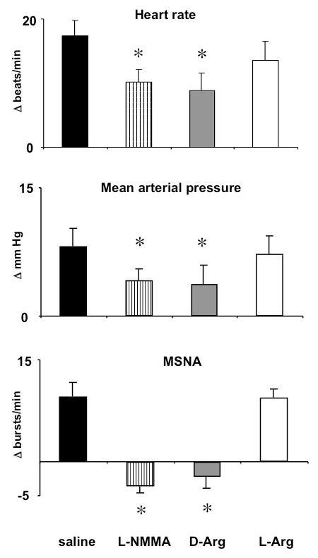 Importantly, the observation that L-NMMA did not alter the sympathoneural and haemodynamic response to the cold pressor test in the present, nor those to exercise in an earlier study [9], suggests that NO has differential effects on sympathetic and cardiovascular responsiveness to different forms of stress in humans.
