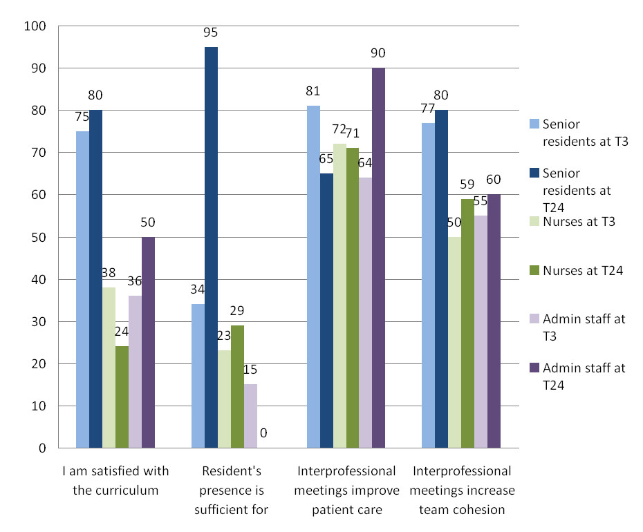 Three and 24 months after its implementation on 1 October 2008, satisfaction with the new curriculum was evaluated through postal and electronic surveys among all residents working in the division, independently from the time they entered the new curriculum, and among senior residents, nurses and administrative staff. The survey was developed to assess the impact of the new curriculum on quality of patient care, team work, and residents’ learning, consisted of questionnaire items developed using a Delphi-type of process. A sample of residents, senior residents, nurses and administrative staff were asked to make suggestions about the topics/themes to survey. A first survey draft was then sent back to them and content and formulations were modified according to their remarks. The final questionnaire included 10 items using a 5-point Likert scale (not agree (1) to fully agree (5). We focus here on the 4 most relevant items dealing with the major curriculum changes: global satisfaction, amount of learning, difficulties with patient follow-up over the week, impact of interprofessional meetings on patient care, and team work. They included the following questions: 1) I am globally satisfied with the curriculum organisation which allows residents to follow patients during two years and to increase their clinical experience by rotating in different units of the division; 2) The presence of residents in the unit during half a week is sufficient for patient follow-up; 3) Interprofessional meetings improve the quality of patient care; 4) Interprofessional meetings increase team building and cohesion. Two additional questions were added for residents: 1a) the new curriculum increases my learning 1b) to work on two different sites creates more benefits than difficulties.