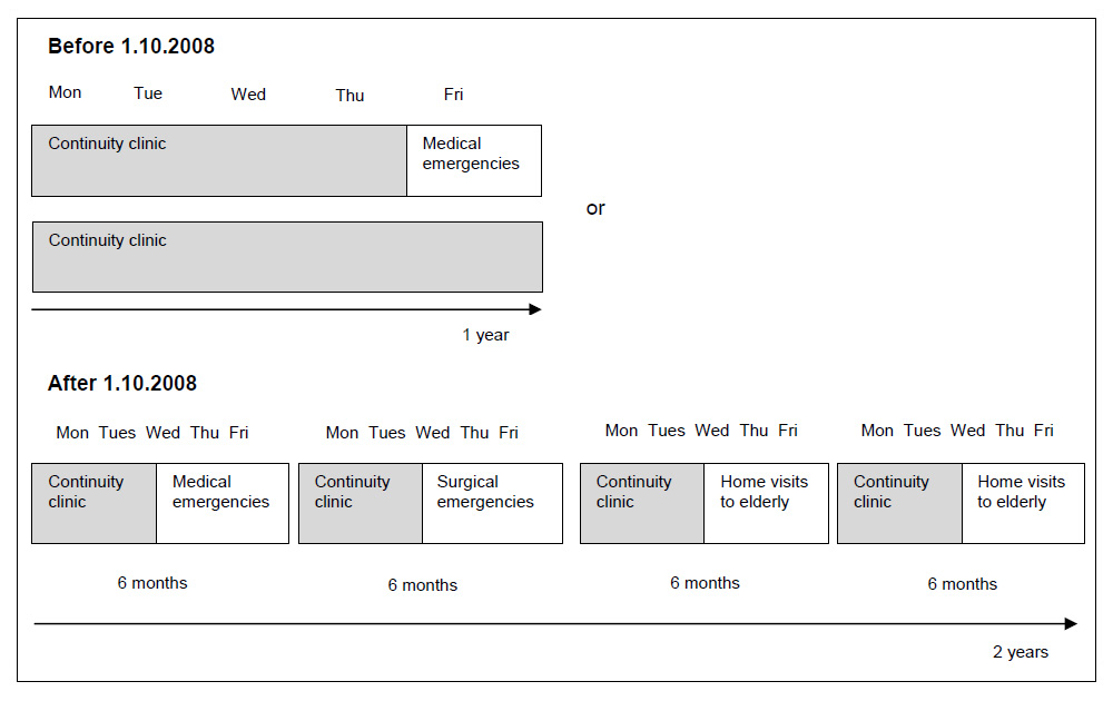 The new 2-year postgraduate curriculum was developed to ensure that residents would be exposed to a sufficiently broad spectrum of clinical activities and to an appropriate case mix of patients, while facilitating continuity of care on a longer follow-up period for chronic patients. It required redefining core competences to be acquired, reorganising the residents’ working week in two different clinical activities and strengthening interprofessional collaboration to ensure patient follow-up and communication. Despite management difficulties linked to these entangled activities and some resistance to change from some professional groups, the new curriculum seemed to meet some of its educational objectives. Most residents who responded to the survey expressed their satisfaction with the new curriculum, particularly because of the wide variety of learning experiences. Combination of acute and longitudinal clinical activities where especially appreciated. Residents acknowledged that working in two different sites provided a positive balance. Interprofessional meetings were highly valued by all collaborators. However residents, nursing and administrative staff reported difficulties in patient follow-up due to decreased time spent by residents in each clinical unit.
