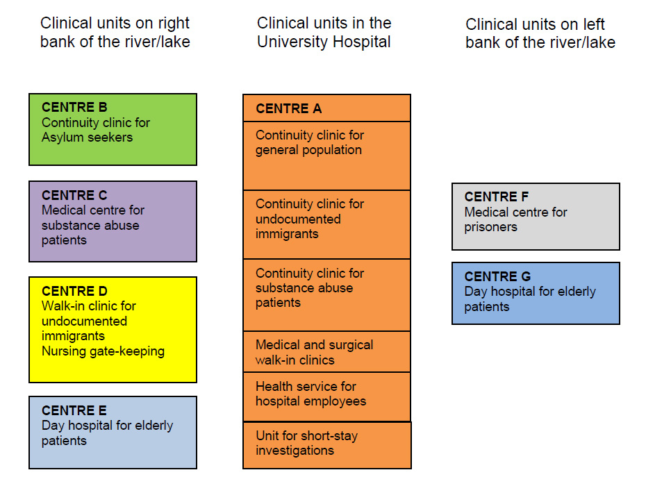 The Division of primary care medicine is part of the Department of Community Medicine, Primary Care and Emergency Medicine at the University Hospitals of Geneva, Switzerland. It is spread out over 7 geographically distinct medical sites over the city (fig. 1). However, most clinical activities are conducted in the main hospital building (fig. 1). Its mission consists in delivering medical care, in providing pre- and post-graduate training, and in conducting research in community-based clinics in Geneva, a canton of 450000 inhabitants. Each year, it provides 15000 scheduled medical consultations and 13000 consultations at its medical and surgical walk-in emergency clinics. It also trains 38 full time residents in ambulatory care. Its patient population includes the general population of Geneva and, more specifically, vulnerable populations such as asylum seekers, undocumented migrants, patients without insurance coverage, prisoners, frail elderly people bound to their homes, and patients with substance abuse. A previous study showed that 50% of the patients attending the primary care clinic were immigrants and that 40% did not speak French [16].