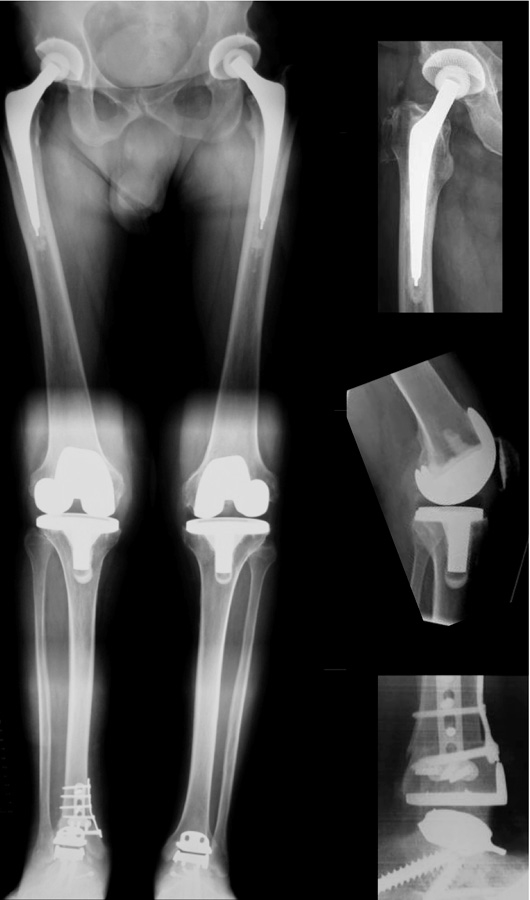 Multi-level surgery: 53 year old patients with rheumatoid and psoriasis arthritis, consistent of two total hip arthroplasties, two total knee arthroplasties, realignment surgery of the right ankle, and two total ankle replacements.
