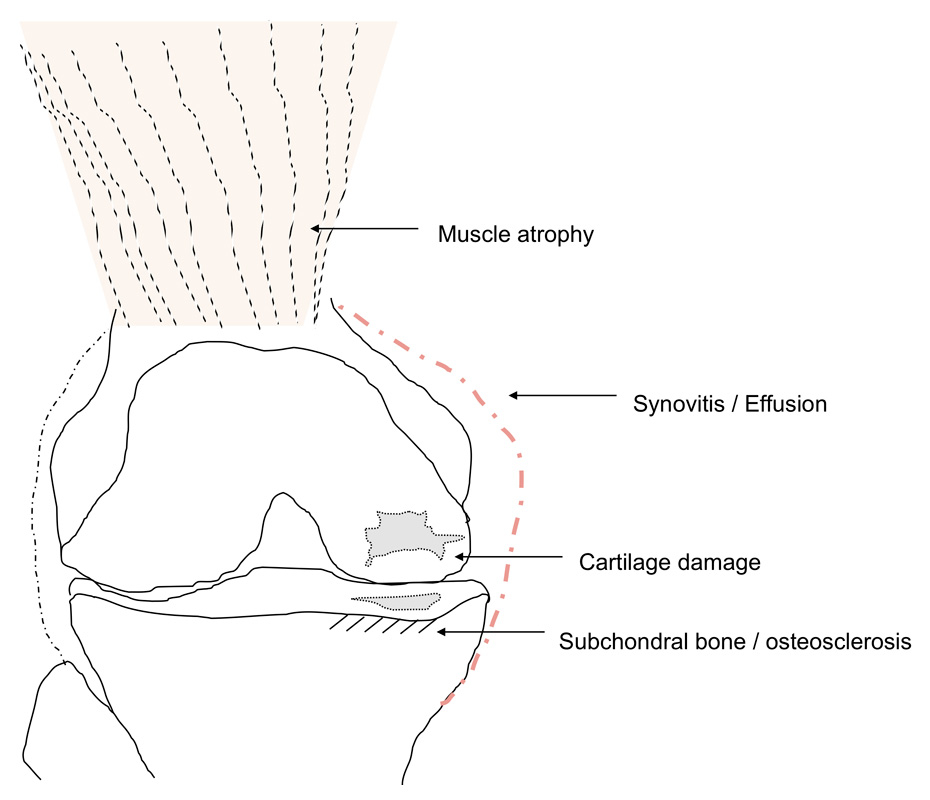 Schematic illustration of OA as a “whole joint disease” with structures involved in OA pathology. Muscle atrophy can cause OA, but is also seen as a consequence of OA, e.g., pain-induced. Synovitis with secretion of proinflammatory cytokines into the joint space correlates with pain and radiological progression. Cartilage degradation is the hallmark of OA. Subchondral bone pathology is also observed in OA, ultimately leading to osteosclerosis.