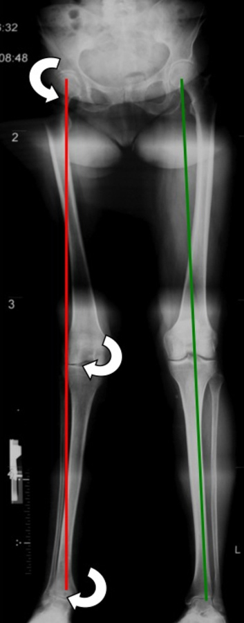 Long leg film with right side genu valgum and advanced ankle arthritis. The white arrows indicate the abduction moments on each joint resulting from the deviated mechanical axis.