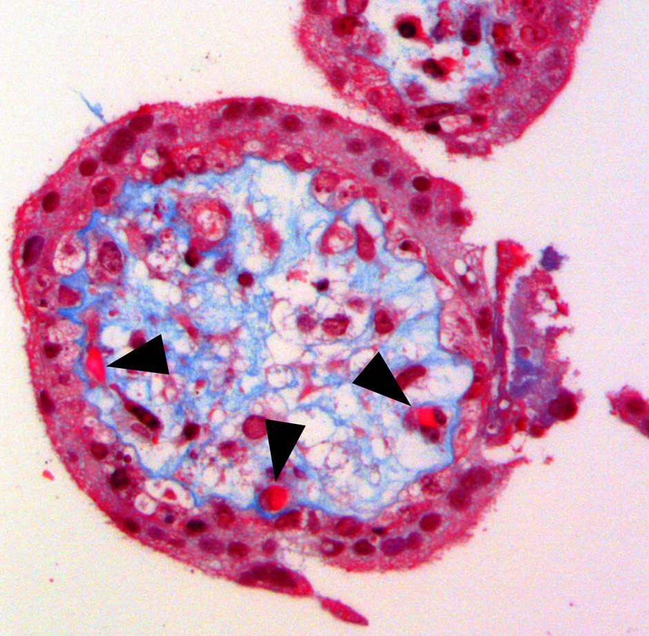 Histomorphology of a chorionic villus showing the outer trophoblastic coverage surrounding the inner foetal mesenchyme also comprising the foetal capillaries (black arrows). (Reprinted from: Weber B, Zeisberger SM, Hoerstrup SP. Prenatally harvested cells for cardiovascular tissue engineering: Fabrication of autologous implants prior to birth. Placenta. 2011;32(Suppl. 4):S316–9. © Elsevier, Oxford, UK, with kind permission).