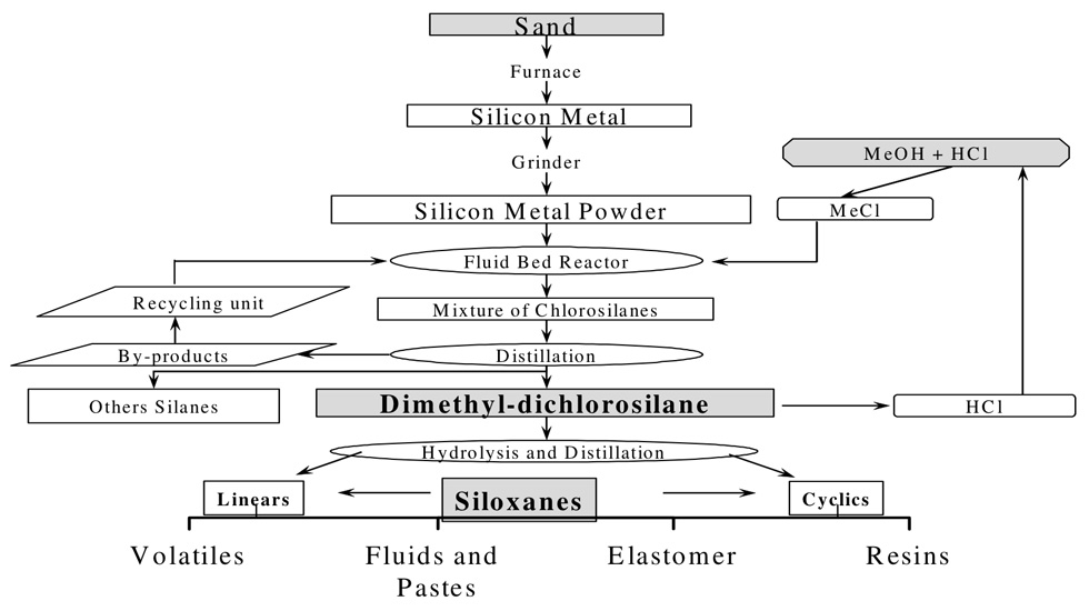 Flow chart of the process – starting with sand – for making siloxane-based materials, including silicone rubber and silicone gel used in breast implants. Source: Wikimedia Commons, © Naweedkhan.
