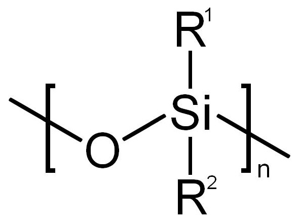 Silicones [3] should not be confused with the chemical element, silicon, which is part of the composition of silicones. Silicones are peculiar. Unlike many other silicon-containing compounds or materials (e.g., SiO2, quartz mineral) silicones do not occur in nature. They are entirely synthetic. They were first synthesised ca. 1900, and the term “silicones” was invented to describe them. Silicones are polymerised siloxanes (a.k.a. polysiloxanes). They are mixed inorganic-organic polymers with the chemical formula (R2SiO)n where R is an organic side group (e.g., methyl, CH3) attached to a siloxane ...-Si-O-Si-O-Si-O-... “backbone” or chain (fig. 2A, B). The specific example shown, polydimethylsiloxane (PDMS), is the most common polysiloxane [4]. Since the chains must be terminated, the complete PDMS formula is CH3[Si(CH3)2O]nSi(CH3)3. PDMS is an oily, sticky liquid with a viscosity that increases as the average chain length (molecular weight) is increased.