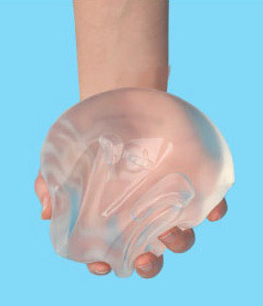 Silicone rubber breast implant shell, to be filled with saline during surgery. In-situ filling allows for custom volume adjustment. If later (e.g., years) after implantation the saline-filled shell ruptures, the saline disperses rapidly and harmlessly, but makes a highly obvious change in the recipient’s appearance.
