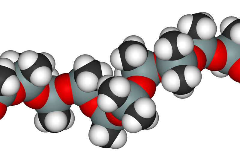 Three-dimensional representation of polydimethylsiloxane molecular structure. The large bond angles and bond lengths result in polymers which tend to be much more flexible and stretchable than rubbers with a carbon “backbone” – i.e. -C-C-C-. Source: Wikimedia Commons.