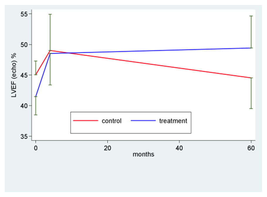 LVEF – % Baseline 4 months 60 months | 45 (5) 49 (12) 45 (8) | * – 0.5 (–5.4; 4.4); p = 0.31 ^ 3.9 (-–2.1; 10); p = 0.19 ‡ –4.5 (–10.7; 1.7) p = 0.15 | 41 (7) 49 (12) 49 (11) | * 7.95 (3.5; 12.4); p <0.001 ^ 7.0 (3.6; 10.4); p <0.0001 ‡ 0.9 (–3.8; 5.6); p = 0.69 | * 8.5 (2.1; 14.8); p = 0.035 ^ 2.8 (–3.4; 9.0); p = 0.27 ‡ 7.9 (1.6; 14.3); p = 0.015 |