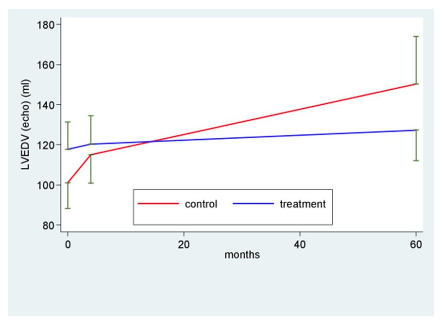 LVEDV – ml Baseline 4 months 60 months | 101 (25) 115 (27) 150 (35) | * 49.3 (28.6; 69.9); p <0.001 ^ 14.1 (2.4; 26.8); p = 0.03 ‡ 35.2 (14.2; 56.2); p = 0.003 | 118 (31) 120 (33) 127 (33) | * 9.6 (–8.1; 27.2); p = 0.50 ^ 2.5 (–9; 13.9); p = 0.66 ‡ 7.1 (–5.8; 20); p = 0.27 | * 39.7 (12.8; 66.6); p = 0.018 ^ 12.2 (–4.4; 28.8); p = 0.19 ‡ 24.6 (0.6; 48.6); p = 0.035 |